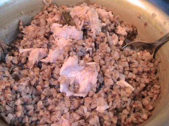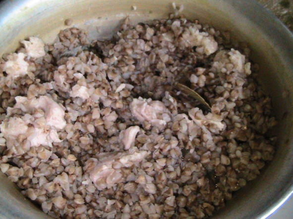 Как закипело – убавить огонь до самого малого и накрыть блюдо крышкой. ПУСТЬ КИПИТ: просто, не вмешивайся! Пусть кипит под закрытой крышкой минут 7—9. Воду -НЕ СОЛИТЬ: потом подсолишь, если нужно будет! Теперь- открой крышку: если вода УЖЕ ПОЧТИ ВСЯ выкипела..Как проверить осталась ли вода в блюде? Ведь если гречка разбухла, то..НЕВИДНО ДНА! Берёшь обычную большую столовую ложку, и… Чуть «раскопай» в середине: и увидишь! Так вот, вода-уже ПОЧТИ ВСЯ выкипела. Или УЖЕ: вся выкипела. Берёшь маленький листик лаврушки: сушёной или свежей. Из открытой банки «диетической тушёнки из филе индейки» ложишь в блюдо с гречкой мясо 1/3 (я столько ложил) или половину банки -вместе с желе. Быстро перемешиваешь, и если чуть вода ещё осталась в блюде, пусть «довыкипает"под закрытой крышкой. Если вода уже вся выкипела, тогда ПРОСТО НАКРОЙ БЛЮДО крышкой. И выключи газ! И неси в комнату: чтобы С УДОВОЛЬСТВИЕМ съесть! ВСЕ-пусть едят ту: обычную и..ТОЛСТЕЮТ! А ты-другую: ЛУЧШЕ по-вкусу и… БЕЗ ВРЕДА ДЛЯ СТРОЙНОСТИ!!