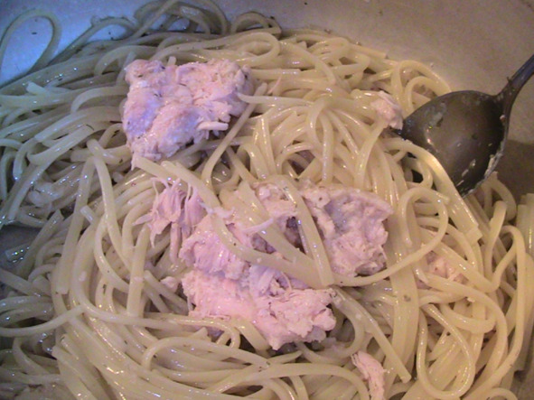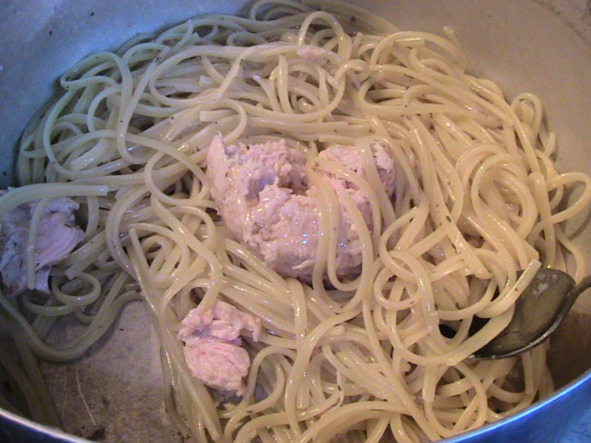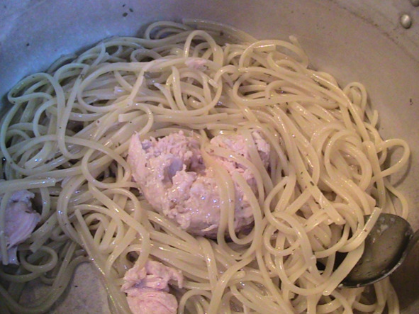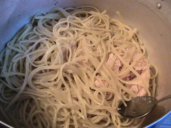 В кастрюлю с уже промытой лапшой бросил на лапшу «диетическую тушёнку», размял сплошной кусок мяса на кусочки помельче, выкладывая из банки и желе»! ТЩАТЕЛЬНО стал всю массу перемешивать вилкой. Только быстро: чтобы меньше остывала! А то тушёнка с холодильника! Остудит макароны!