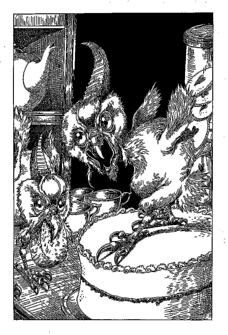 Птица, стоявшая на подставке для торта, издала громкий крик. У неё были светлые пушистые перья и круглые глаза, похожие на мячики для пинг-понга. Она выглядела как нелепый арт-проект. Второй птенец топтался на стойке, пытаясь проглотить булочку.