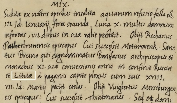 В Кведлинбургских анналах, датированных XI веком, читаем о том, что Бруно был обезглавлен in confinio Rusciae et Lituae, то есть «на границе Руси и Литвы».