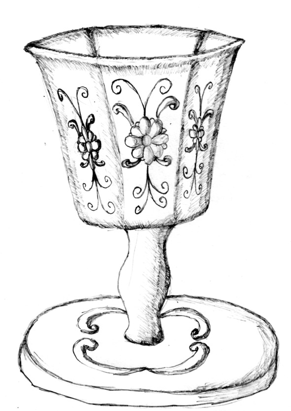 …сосуд был похож на шестигранный стакан с расходящимися наподобие воронки кверху краями и подставкой в виде массивной пластины с утолщённой в средине ножкой…