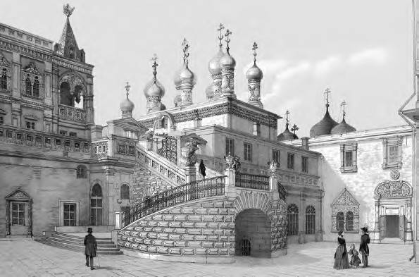 Боярская площадка в Московском Кремле (до 1838 г.). Вид на златоглавый храм Спаса-на-Сенях за Золотой решеткой с лестницей на боярскую площадку, узорчатое крыльцо с теремами и заднюю сторону Грановитых, или Святых, Сеней