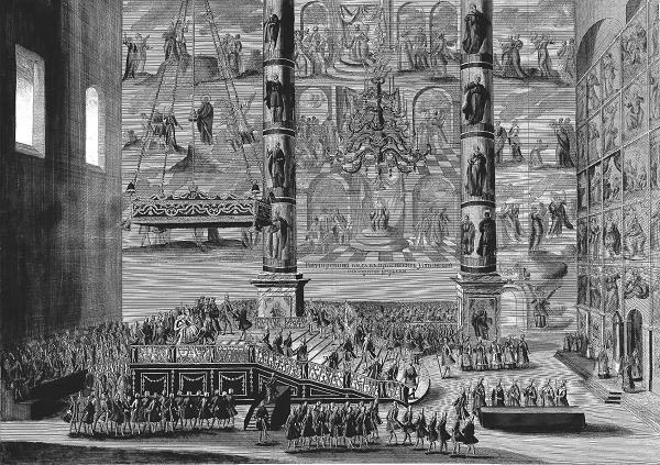Сцена коронации императрицы Елизаветы Петровны в Успенском соборе Московского Кремля. 1744.
