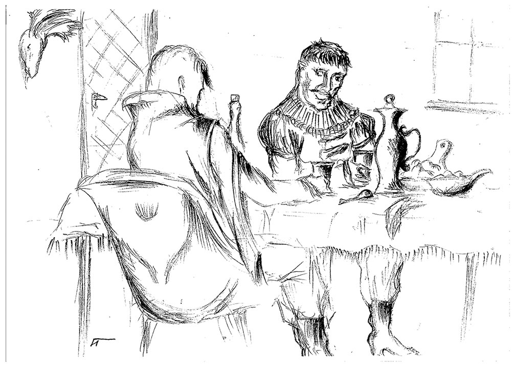 Komisarz zachęcająco machnął ręką – wnet przy stole pojawił się gospodarz. Z pełnym szacunkiem wysłuchał polecenia gościa, ukłonił się w milczeniu i natychmiast udał się do piwnicy, niegłośno wydając rozporządzenia klucznikowi. Po upływie kilku minut na stole komisarza i szlachcica pojawił sie tłoczony półsztof miodu, kilkanaście talerzy z różnymi przekąskami, gliniany dzban wody orazi starożytny niekształtny rondel zbitnu – i po tym Janek cicho znikł.