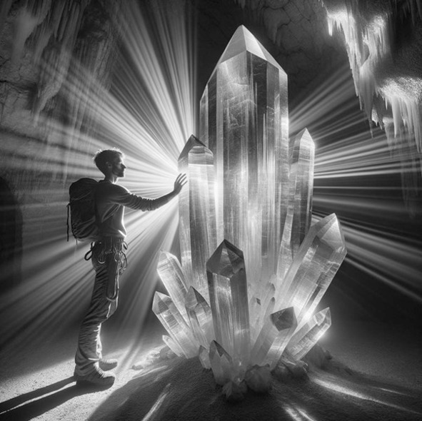 То ли он сам светился, то ли какой-то свет преломлялся сквозь него и освещал комнату разными цветами. Он заметил, что пещера уже совсем не пещера, а красивое огромное помещение с хрустальными стенами. Он увидел в самом ее центре, вверху, круглое отверстие, из которого поток света опускался на кристалл и рассеивался в разные стороны, создавая причудливые узоры.