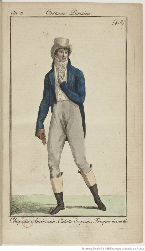 Из вредности или по дотошности, но, образно говоря, следы этих сапог можно обнаружить в знаменитом французском «Жюрналь де Дам эт де Мод», то есть в дамском модном журнале, который издавался в Париже с 1797 по 1839 год. Сапоги точно такого же фасона, хорошо узнаваемые по двухцветному окрасу голенища и характерным хлястикам, впервые появляются на страницах журнала, если автор не ошибается, в 1802 году7 и продолжают постоянно присутствовать примерно до 1816 года8, после чего уступают место другим моделям мужской обуви.