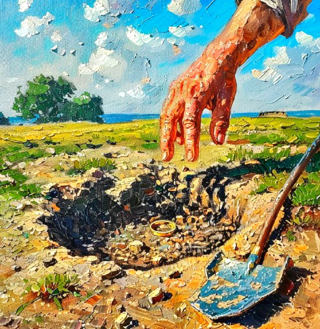 Когда же в чёрной земле сверкнуло что-то празднично жёлтое, наш обезумевший от счастья кладоискатель, затаив дыхание, быстро протянул руку и медленно-медленно вытащил из земли массивное золотое кольцо, по виду – печатку. Дрожащими руками он начал тереть кольцо об штанину, освобождая благородный металл от презренной пыли и грязи, и то, что открылось его взору, когда печатка засияла на солнце во всей своей первозданной красоте, повлекло за собой новую волну восторгов и восклицаний. Наш герой буквально чуть ли не взвизгнул, разразившись целой тирадой, из которой если убрать все матерные слова, то, наверное, ничего бы и не осталось.