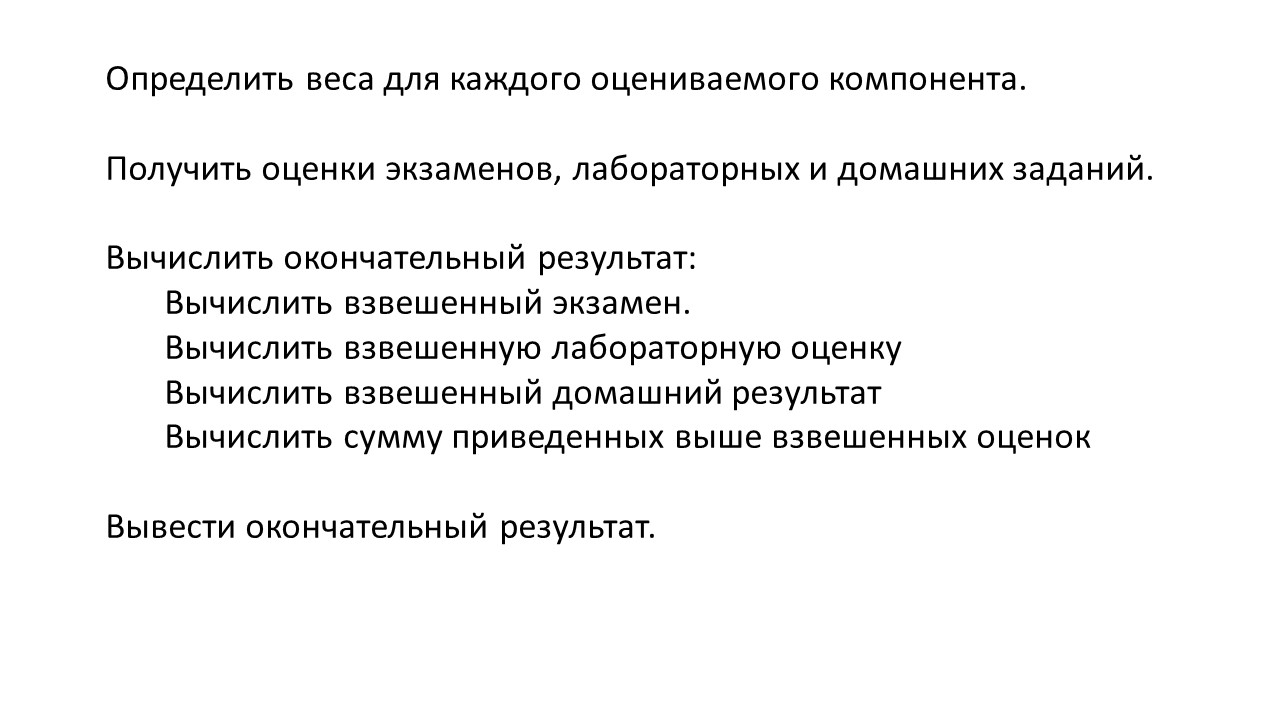 Задача, которую нужно решить, это вычислить итоговую оценку как взвешенную комбинацию работы на экзаменах, лабораторных работах и домашних заданиях.