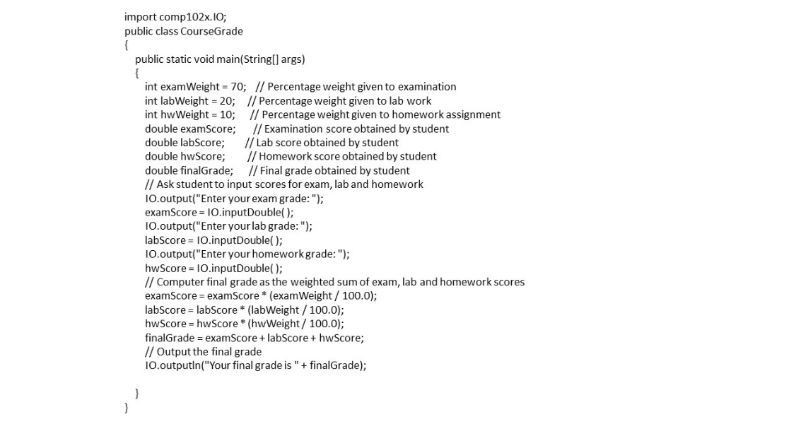 Как вы видели в предыдущих примерах, такие имена, как HelloWorld и CourseGrade были использованы в качестве имен для классов (или программ), а имена examWeight, examScore, labScroe и т.д. были определены в программе CourseGrade.