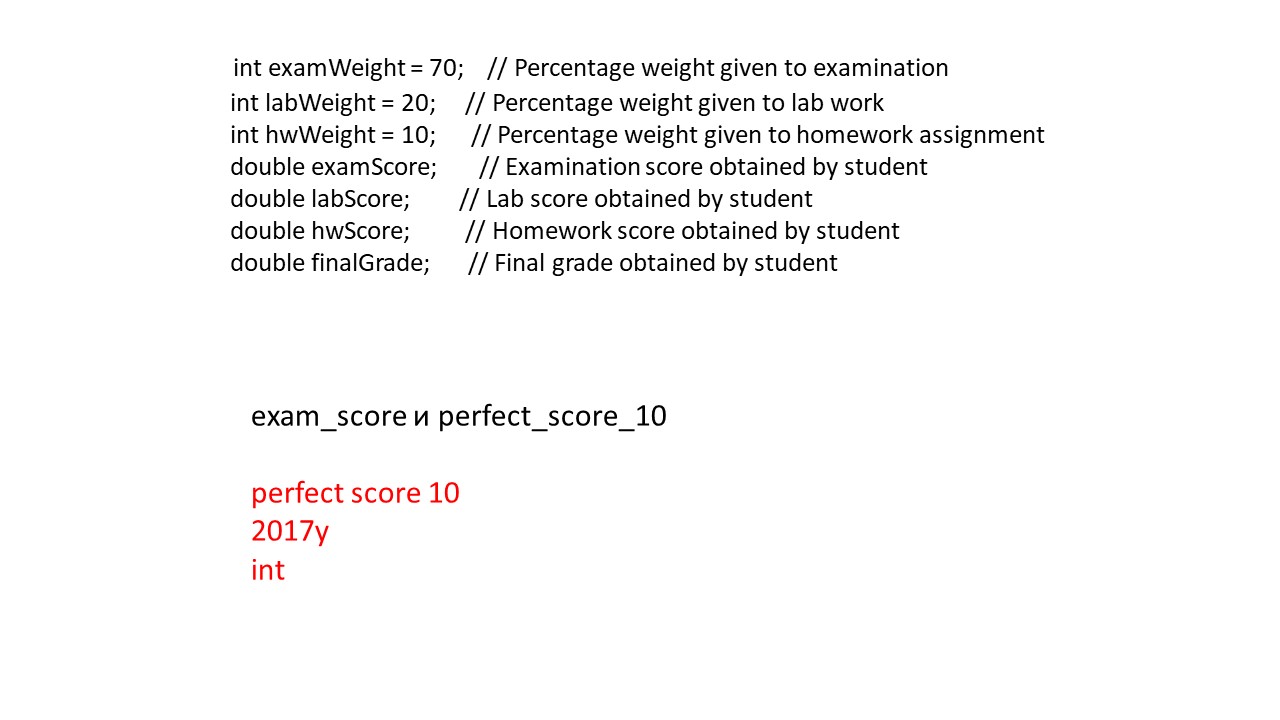 Например, в программе расчета оценки, переменные examScore, labScore и hwScore могут принимать различные значения в зависимости от входных данных.