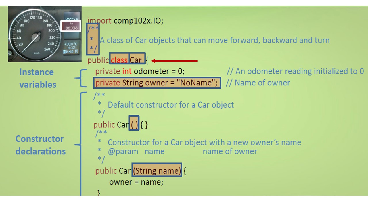 Первая строка после комментария является фактическим объявлением класса с именем Car (автомобиль) с помощью ключевого слова class.
