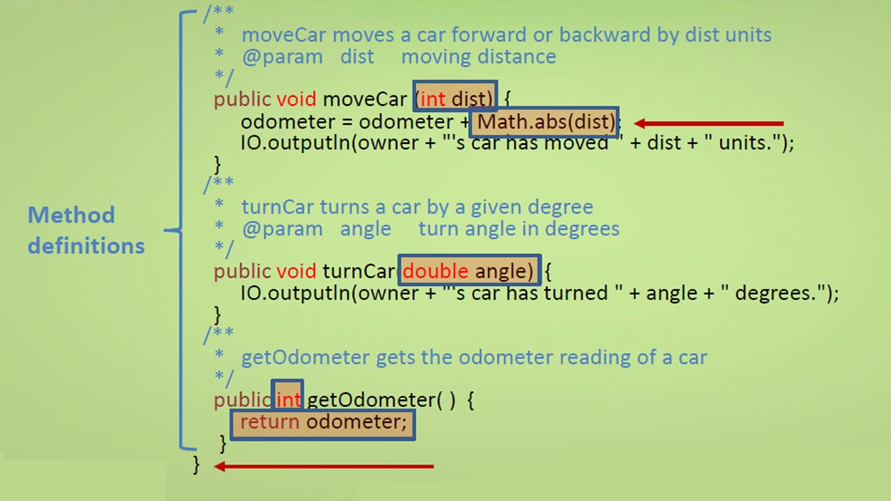Первый метод moveCar перемещает автомобиль на определенное расстояние, и расстояние указано здесь параметром dist целого типа.