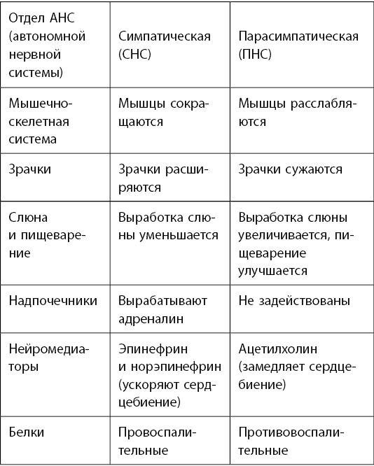 У людей есть пучок нервов, который берет начало в стволе мозга и называется автономной нервной системой (АНС). Она обычно работает автоматически, ниже уровня сознания. Эта часть нервной системы, развившаяся на ранних стадиях нашей эволюции как вида, состоит из двух отделов. Первой развилась симпатическая нервная система (СНС), задача которой заключается в обеспечении нашего физического выживания и выживания генов. Ее основная активность – это генерация реакции «бей, беги или замри». Здесь правит миндалевидное тело. Реакция СНС «бей, беги или замри» существовала у бесчисленного количества видов миллионы лет. Поскольку она эволюционировала, чтобы действовать в ситуациях жизни и смерти, она проходит по очень коротким нейронам и обладает способностью за долю секунды полностью завладевать нашими физическими и эмоциональными ресурсами, наполняя тело гормонами стресса, в том числе кортизолом, и напрягая мышцы.
