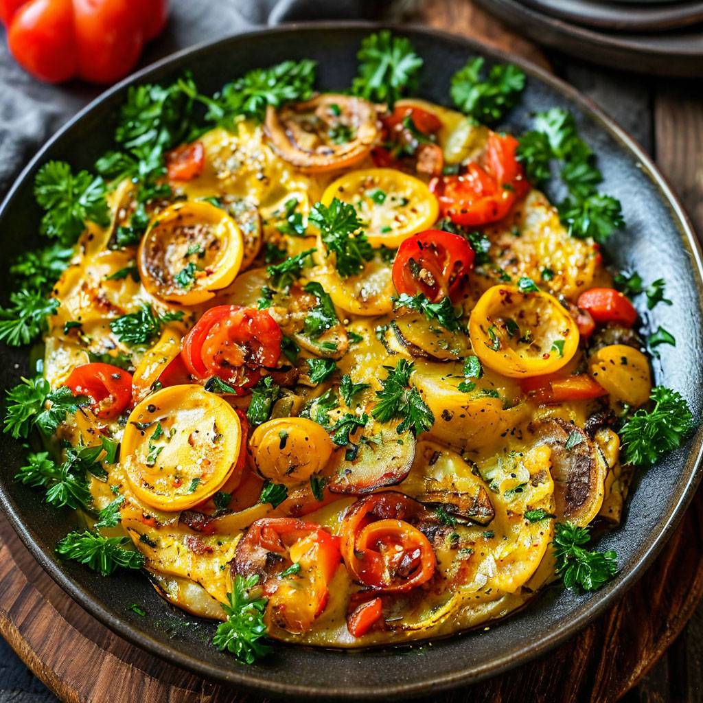 3. Влить яйца в сковороду с овощами и готовить до полной готовности.