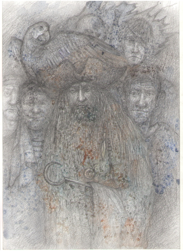 Наконец, они оказались на большом, старом корабле. Колю поставили на землю и развязали. Перед ним стоял большой человек с бородой, треугольной шляпой, деревянной ногой и крюком вместо одной руки.