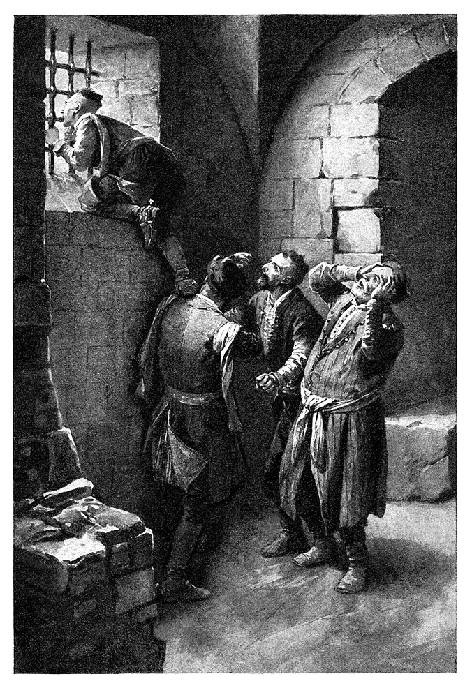 Заглоба был уже изрядно под хмелем, когда трижды бросил гетману в лицо страшное слово: «Изменник!» Только час спустя, когда хмель соскочил с лысой его головы и он с обоими Скшетускими и паном Михалом очутился в кейданском замковом подземелье, старик понял, какой опасности подверг и себя, и своих друзей, и очень встревожился.