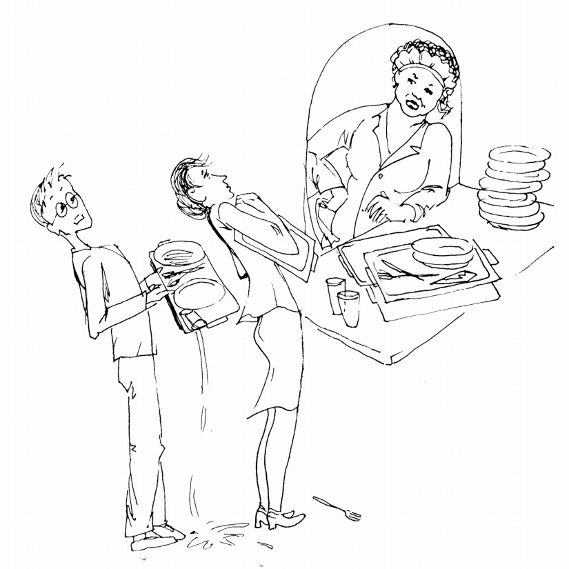 Прошло несколько дней. Мы снова обедаем в столовке «для тупорылых» – такое уж приклеилось название. «Хорошая тетя» протирает подносы и складывает их в стопку. Мои коллеги выбирают салатики и изучают меню. Олеся, симпатизирующая «хорошей тете», пришла позже всех и встала в конец очереди. Берет из стопки поднос… и случайно роняет его на пол. Замешкалась. Думает, что делать дальше. Вроде как с пола поднимать и набирать еду неправильно, положить в стопку тоже. Решила аккуратно поставить поднос ребром около стойки и взять новый.
