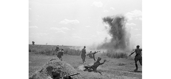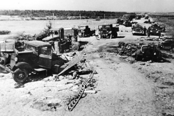 Минск горел! За двадцать километровВидно было как огонь пылал!Черный пепел, относимый ветром,Словно траур землю покрывал… Боль в груди кричала как подранок… Каждый кустик, каждый поворот Блеском угрожающих берданок Спрашивал тревожно: «Кто идет?!»Да, мы идем! Мы плачем и отходим!Но мы еще вернемся! И тогда…Трижды страшен будет гнев народа,Вставшего за наши города! Путь назад для нас не будет длинным! В сердце ярость! Не тоска, не грусть! Я не знаю, что я сделаю с Берлином… Если до него я доберусь.