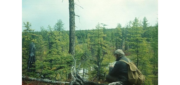 Векшин проходит выше по течению и за поворотом замечает крупное обнажение. Разрывая черно-зеленый занавес тайги, оно широким скалистым выступом нависает над рекой. Он взбирается к нему и видит широкую сильно перемятую складку с круто падающими темными прослоями.
