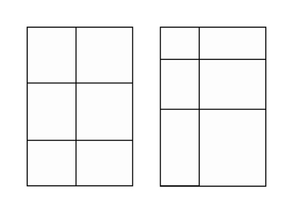 Фигура на рис. 2 слева не сбалансирована, потому что вертикальная черта заметно сдвинута от центра, но все же не так сильно, чтобы это казалось неслучайным. Поперечное членение тоже кажется случайным и вызывает зрительный дискомфорт. Фигура справа, напротив, не поделена на одинаковые секции, но такое членение не кажется произвольным.