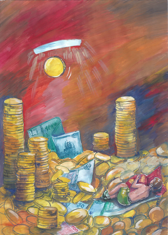 The brownie liked to live in the pig. He covered himself with bonds, which also were there and for more softness he put several bonds under his head and back. And when it was dull for him to sit there doing nothing, the brownie began to count coins. He put them in piles and they fell down from the tops of the piles and jingled. The brownie liked to count money so much, that he almost didn’t get out of the money-box. And the more he counted the more he liked it. He completely forgot about secrecy and started to count money when the whole family was at home. The coins jingled. The cat shuddered. Ervin ran to the money-box. But he couldn’t see anything there, because the brownie covered himself with bonds. Ervin shook the pig and the brownie was shaken together with coins. When Ervin became certain that all the coins were still there, he went back to the kitchen. And the cat stayed in the hall and reminded the brownie about necessity of secrecy. And when he had to do it for the fifth or even for the sixth time, the cat didn’t stand it and moved the brownie to another place. He dragged the brownie out of the money-box and put him into the first suitable place he saw. And that place was a pot on a bookshelf. The pot was red with spots. And though it was meant for preparing food, it was so beautiful that mum kept it on the shelf as an ornament. It had been there for a long time already.