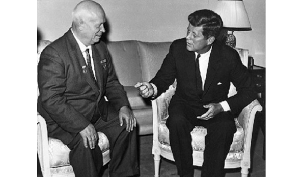 2. Хрущев Никита Сергеевич, Первый Секретарь ЦК КПСС (1953—1964), Председатель Совета Министров СССР. На фотографии – беседа с президентом США Джоном Кеннеди. Рождение – 1894 г., село Калиновка Курской области, семья шахтера. Обучение в школе, работа пастухом, слесарем на шахте. Вступление в партию большевиков, участие в Гражданской войне (политический комиссар, командир отряда). С 1922 года – учеба на рабочем факультете (рабфаке) Донецкого политехнического института, женитьба, назначение партийным руководителем одного из уездов Сталинского (Юзовского) округа. 1929 г. – учеба в Промышленной академии (Москва), выдвижение на пост первого секретаря Московского областного комитета. 1938 г. – Хрущев – первый секретарь ЦК КП (б) Украины. При нем, по разным поводам, проводятся массовые (десятки тысяч) аресты партийцев. Следует заметить, что «торможение» такого рода процессов, не активность в терроре, вызывали недовольство Сталина, со всеми последствиями. Великая Отечественная война. До середины 1942 г. Хрущев «проваливает» две крупные операции (здесь он не хуже и не лучше большинства советских военачальников), но в обороне Сталинграда, на передовых позициях, показывает себя неплохо. После войны – смена нескольких ответственных постов, назначение секретарем (не Генеральным) ЦК ВКП (б). Июнь 1953 г. – Хрущев выступает инициатором смещения со всех постов, ареста и расстрела Л. Берии. 1954 г. – в связи со строительством Северокрымского канала, желательностью ведения гидротехнических работ в рамках одной республики, а также к юбилею Переяславской Рады – передача Крыма в состав Украинской ССР. Президиум ВС Украины отмечает, что этот акт: «…является свидетельством безграничного доверия великого русского народа украинскому народу». Июнь 1957 г. – заседание Президиума ЦК смещает Хрущева с поста первого секретаря на 4 дня. Никита Сергеевич и Кº созывают пленум ЦК КПСС, берут реванш. Поскольку время уже «детское», победители всего лишь выводят из состава ЦК Молотова, Маленкова, Кагановича и «примкнувшего к ним Шепилова». Спустя четыре месяца от обязанностей министра обороны СССР, членства в ЦК КПСС освобождается авторитарный, с наполеоновскими амбициями Г. К. Жуков.