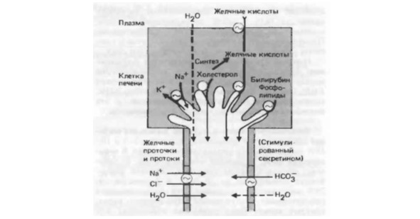 Выделительная функция печени заключается в секреции желчи. Продукт секреции образуется в печени непрерывно, а в тонкий кишечник поступает только в процессе пищеварения. Вне пищеварения желчь собирается в желчный пузырь, в котором концентрация ее компонентов изменяется за счет обратного всасывания воды. Желчь на 90% состоит из воды, минеральных солей, слизи, липидов холестерола, лецитина, желчных кислот и билирубина. Клетки печени образуют тонкие пластинки, подобные кирпичной кладке, которые разделяются узкими щелевидными пространствами – пространство Диссе. Субэндотелиальное пространство Диссе представляют собой синусоиды (неравномерно расширенные сосуды) заполненные кровью. По строению синусоиды эквивалентны пористой капиллярной сети. В стенках синусоидов есть поры, позволяющие проникать таким крупным молекулам как альбумин и липопротеин. По мельчайшим канальцам – желчным капиллярам, локализованным пограничными мембранами двух соседних клеток печени, – желчь стекает в более крупные канальцы Геринга. Канальцы внутри долек печени и между ними сливаются и образуют в конечном итоге печеночный проток, от последнего отходит пузырный проток к желчному пузырю. После слияния печеночный и пузырный протоки формируют общий желчный проток, который открывается в двенадцатиперстную кишку.
