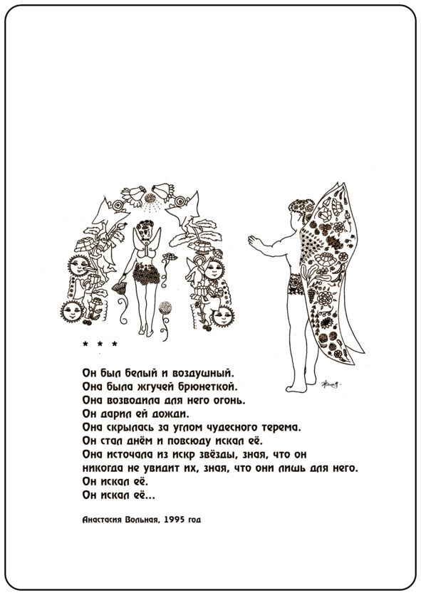 Он был белый и воздушный.Она была жгучей брюнеткой.Она возводила для него огонь.Он дарил ей дожди.Она скрылась за углом чудесного терема.Он стал днём и повсюду искал её.Она источала из искр звёзды, зная, что онникогда не увидит их, зная, что они лишь для него.Он искал её.Он искал её.1994 год