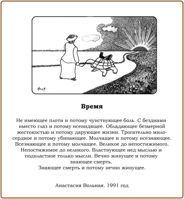 Не имеющее плоти, и потому чувствующее боль. С безднами вместо глаз и потому всевидящее. Обладающее безмерной жестокостью и потому дарующее жизни. Трогательно милосердное и потому убивающее. Молчащее и потому всезнающее. Всезнающее и потому молчащее. Великое до непостижимого. Непостижимое до великого. Властвующее над мыслью и подвластное только мысли. Вечно живущее и потому знающее смерть. Знающее смерть и потому вечно живущее.