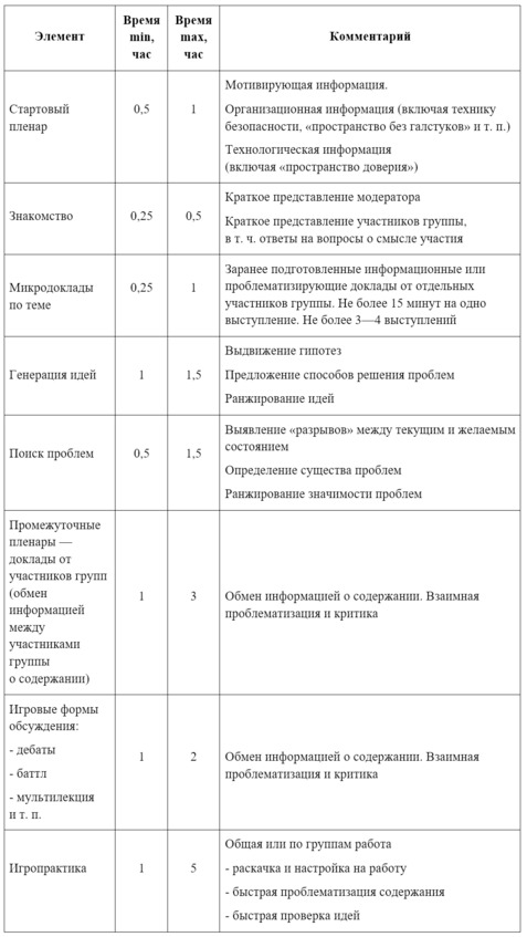 • проектирование сессии – подготовка тематики обсуждения, определение контекста и ситуации, в которой обсуждение проводится, разработка схемы представлений о предмете обсуждений, форм промежуточного и финального представления результатов обсуждения, подбор участников обсуждения и способа разделения на группы и решение многих других вопросов;