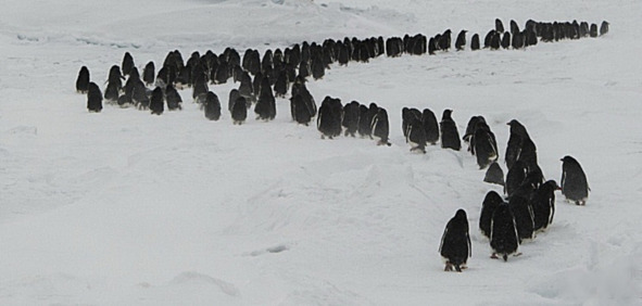 Ответ не заставил себя ждать – когда мы подошли к восточному берегу полуострова, перед нами открылось фантастическое зрелище: там, вдали у горизонта у открытой воды, по припаю в строну полуострова Ардли, извиваясь черной лентой в несколько километров, в нашу сторону шло несметное число пингвинов Папуа. Цепочка извивалась, видимо, пингвины обходили торосы, останавливались, отдыхали, дожидались отставших, затем снова продолжали движение. Их было несколько тысяч. Те, которые вышли на берег, не разбегались, а спокойно ждали отставших. Мне показалось, что после того как пингвины вступали на берег острова, они поворачивались в сторону приближающихся сородичей, как бы ожидая, когда все племя придет на место будущей колонии.