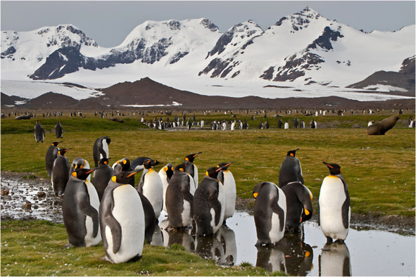 Королевские пингвины внешним видом похожи на императорских, но они мельче. Взрослые птицы имеют серую спину, по бокам чёрной головы крупные яркие оранжевые пятна и белая грудь. Вес до 15 кг, рост до 1 м. Большие шумные колонии, насчитывают несколько десятков тысяч пар. Питается королевский пингвин планктоном и мелкими морскими животными, которые в изобилии водятся вблизи побережья островов (головоногие моллюски, мелкая рыба и кальмары).