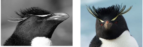 На головах – желтые или оранжевые плюмажи, черные крестообразные полосы идут от макушки к боковой части головы. Пингвин Шлегеля опознается по белому подбородку, золотоволосый пингвин – по черному.