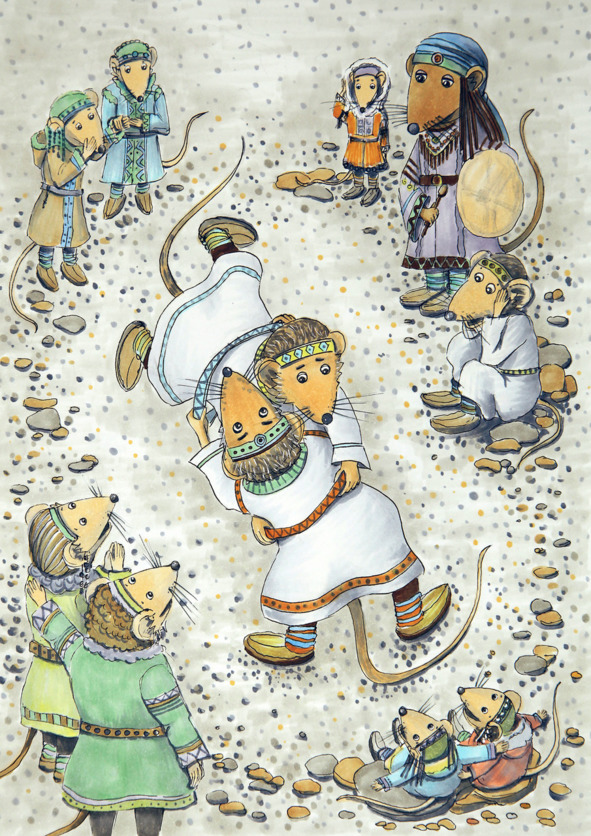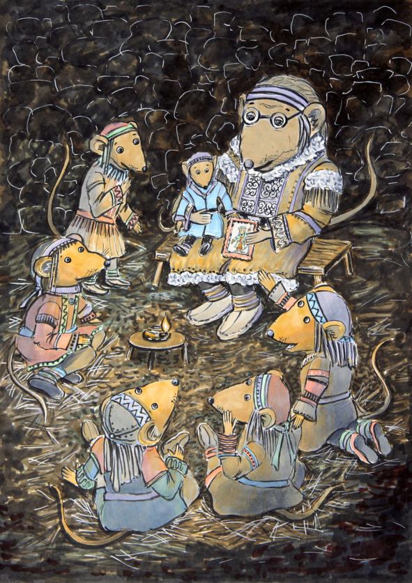 Короткое северное лето надолго сменяется зимой. Солнце, промочив лапы, умирает до весны. Бог Нга укрывает землю снежным пологом. Тогда мыши уходят в норы. Они коротают дни играми, беседами и, конечно, рассказывают сказки.