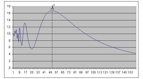 Рис. 73В. Зависимость коэффициента направленного действия D от длины волны [34] для пирамиды Менкаура, оптимальная длина волны – 52 м
