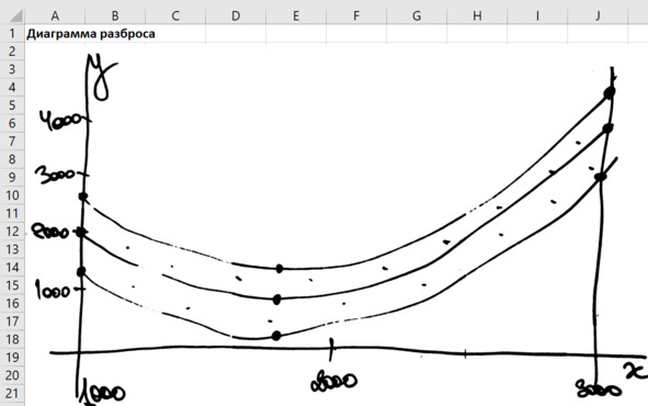 Изображение исходных данных называется диаграммой разброса. Каждая пара чисел X и Y изображается отдельной точкой. Точки между собой не соединяют.
