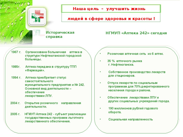 Наше предприятие организовано более сорока лет назад. За это время мы претерпели несколько реорганизаций, прожили несколько жизненных циклов… В любом случае, мы работаем эффективно. На сегодняшний день, в нашей сети шесть аптек. Мы занимаем примерно 35% рынка города Нефтеюганска. Занимаемся выполнением социальных программ и обеспечиваем учебно-профилактические учреждения. Наша особенность в том, что мы муниципальное предприятие, но, в любом случае, мы работаем в реальном бизнес-поле и при этом выполняем социальные задачи.