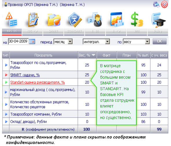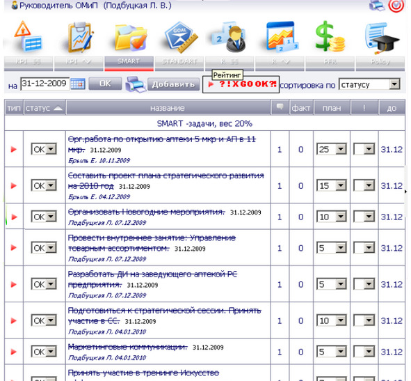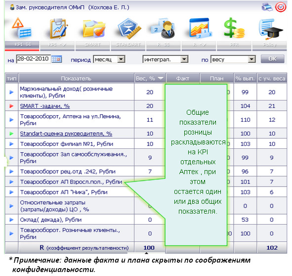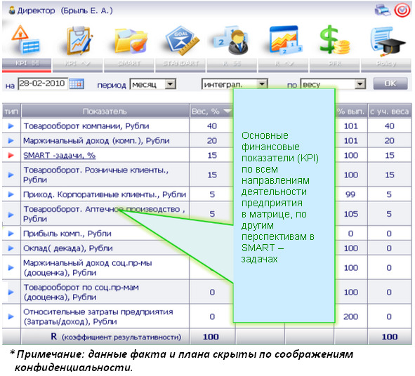 Считаю, что KPI-технология – это конкурентное преимущество компании, позволяющее вести бизнес более эффективно. Нам удалось ее внедрить, несмотря на грандиозные потери нашего оборота и доходности с других видов деятельности в 2009 году. Благодаря ей мы смогли развить розничное направление. Открыли одну большую аптеку в центре города и готовим к открытию еще одну небольшую аптеку. Мы сократили затраты при сохранении ФОТа и получили прибыль выше запланированного уровня. И хочу сказать, из-за приобретения помещения для открытия аптеки (563 кв. м. в центре города) значительно увеличилась капитализация компании. Вот такие результаты нашей деятельности в 2009 году.