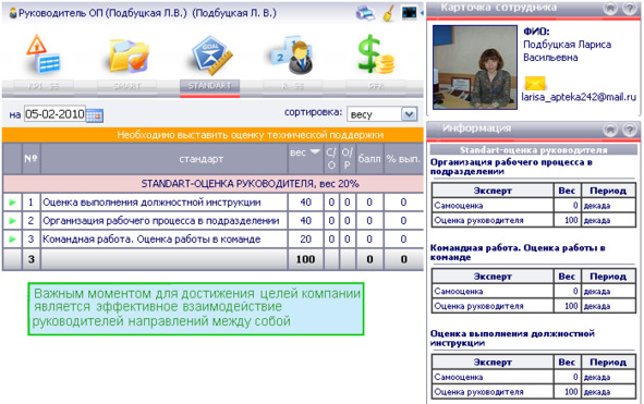 STANDART – оценка разбита у сервисных специалистов на некоторые аспекты (илл. 19). Это выполнение должностной инструкции и, в данном случае, у инженера по охране труда – это использование технических ресурсов и оценка внутреннего клиента.