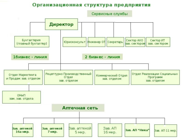 Наша организационная структура (илл. 3) достаточно плоская: директор сервисной службы, первая бизнес-линия – это рецептурно-производственный отдел, также отдел маркетинга и продаж, который включает в себя, в настоящий момент, шесть аптек.