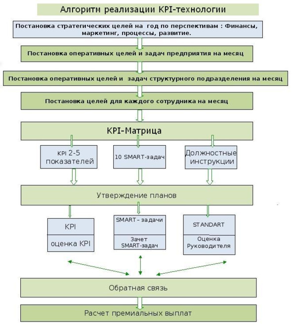 Алгоритм реализации KPI-технологии у нас на предприятии (илл. 7). На сайте программы KPI-Drive задавали вопрос (смотрите в комментариях): «Каким образом стратегия переносится на административный уровень?». Вот примерно по такой схеме мы работаем, то есть у нас стратегический план развития в формате BSС по направлениям финансы и маркетинг процесса развития. Из этого стратегического плана показатели и задачи переносятся в оперативный план на месяц в матрицу директора. И далее каскадируются в цели-задачи сотрудников, вернее, руководителей структурных подразделений. Затем каждому сотруднику попадают в матрицу KPI-Drive уже по KPI-технологии: KPI-показатели, SMART-задачи и STANDART-оценка руководителя каждого сотрудника. В конце месяца происходит оценка результатов. После обратной связи рассчитывается премиальная выплата каждому сотруднику по его результативности. Хочу обратить ваше внимание на такой пример каскадирования целей из стратегического плана развития в оперативный на месяц.