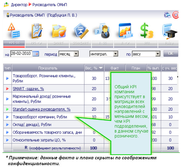 Дальше всё это каскадируется в матрицы руководителей направлений. В данном случае, у нас Лариса Васильевна Подбуцкая. Она является руководителем розничного направления. Здесь уже рекомпозиция KPI с матрицей директора в матрицу руководителя розницы, то есть: товарооборот и розничные клиенты, маржинальный доход и товарооборот компании (илл. 9).