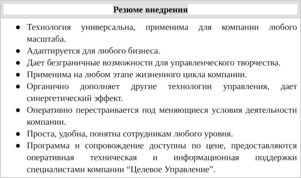 Мы стали легко управлять изменяющимися целями. Например, в один месяц важно было отгружать товар, в другой месяц – собирать деньги, или, например, контролировать просроченную дебиторскую задолженность. Была у нас такая проблема, что просроченная задолженность превышала все мыслимые и немыслимые границы. Поставив со значительным весом этот показатель, волшебным образом менеджеры стали приносить больше денег, просроченная задолженность сократилась. Тоже положительный момент, который, собственно, позволил мне как руководителю оценить важность этого продукта.