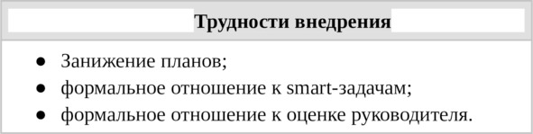 С каким трудностями мы столкнулись при внедрении (таб. 2). Люди посмотрели, поработали, немного привыкли к программе и начали тоже как-то пытаться управлять. Мы применяли систему как планирование сверху вниз с корректировкой. Ну, и пытались по-разному. Также планирование снизу, ведь менеджеры хорошо знают потребности своих клиентов, их количество. Так, однажды наши менеджеры, чтобы легче и комфортнее выходить на свою результативность, стали занижать планы. Над этим мы тоже работали и, в общем-то, достигли некоторой золотой середины. Также был перекос в формальном отношении сотрудников к SMART-задачам. Например, если человек генерирует задачи сам, то уже начинает высасывать их из пальца. Иной раз, задачи там все сделаны, но сделаны не совсем важные. Но когда появились полноценные модули SMART, эти перекосы были разрешены. Ну и, в оценке руководителя были такие негативные моменты, как завышенные оценки линейными руководителями. Но это, как бы, всё текущие проблемы.