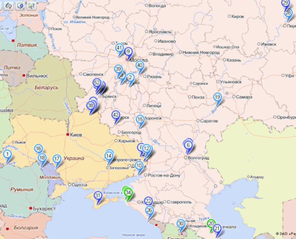 Рис. 13. Карта распроcтранения памятников раннего и среднего неолита, самые древние (зеленые), ранние (голубые) и средние (синие) на Русской Равнине [12]