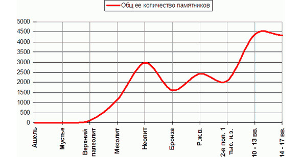 Рис. 15. Общее количество памятников на территории Русской Равнины, логарифмическая шкала [12]