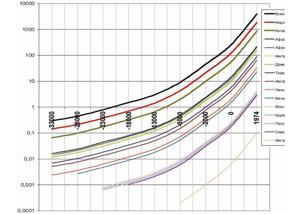 Рис. 17. Корреляция численности населения древнего и современного периодов. По горизонтальной оси – годы, по вертикальной оси – количество носителей в миллионах человек [13]
