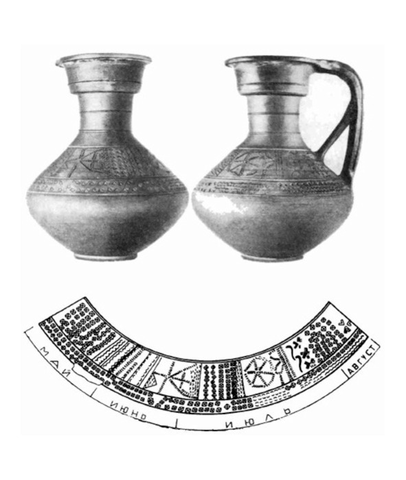 Рис. 29. Первые календари и символы на посуде, кувшинах, прялках и гребнях [13]