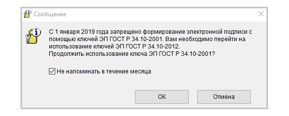 Ранее пользователи использовали устаревший ГОСТ Р 34.10—2001 (кратко ГОСТ 2001), принятый постановлением Госстандарта России №380-ст от 12 сентября 2001 года. Но время идет, требуются все более мощные способы защиты информации, и ГОСТ 2012 начал потихоньку вытеснять ГОСТ 2001 с персональных компьютеров пользователей. Фактически, ГОСТ 2001 уже запрещен, выпуск электронных подписей по нему не производится, а сам ГОСТ 2001 не работает с 1 января 2020 года. Пользователям, которые его использовали в 2019 году, выводилась вот такая табличка:
