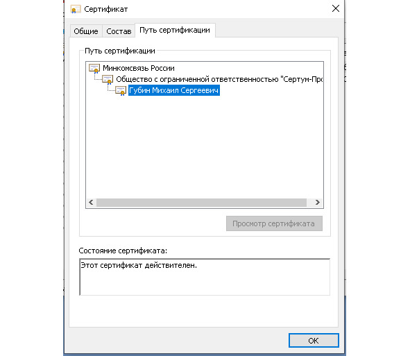 Как мы видим, цепочка сертификатов построена не абы как. Самым верхним является сертификат Министерства цифрового развития, связи и массовых коммуникаций Российской Федерации (Минкомсвязь) России, поскольку именно Минкомсвязь вместе с ФСБ России разрешает всем без исключения удостоверяющим центрам вести свою деятельность. После сертификата Минкомсвязи идет сертификат текущего удостоверяющего центра – это общество с ограниченной ответственностью «Сертум-Про», входящее в состав компании СКБ «Контур». Самым последним в цепочке выступает мой сертификат. У вас цепочки сертификатов будут иметь похожую структуру, причем Минкомсвязь будет обязательным элементом, а удостоверяющий центр и название компании либо физического лица будут уже вашими.